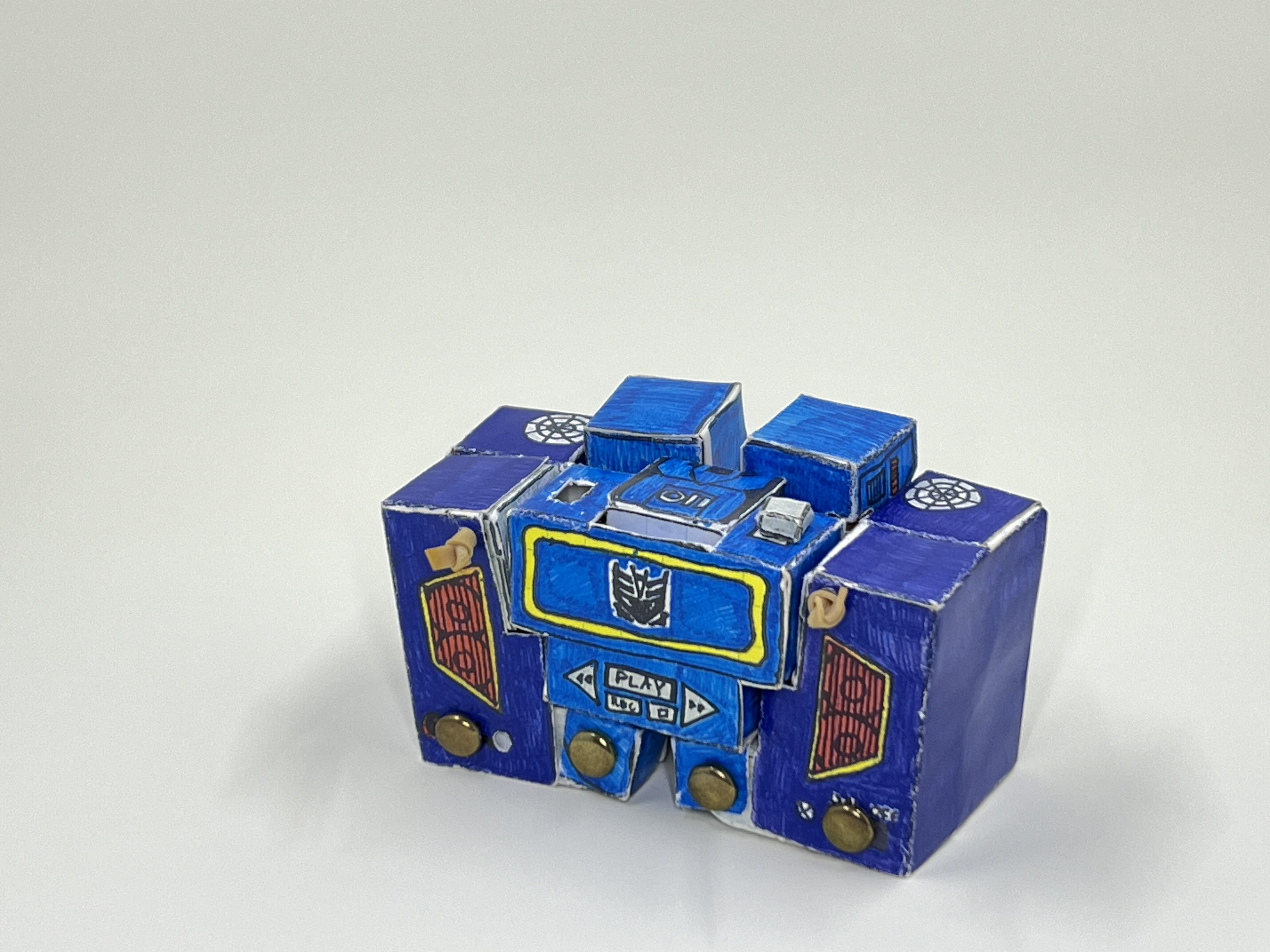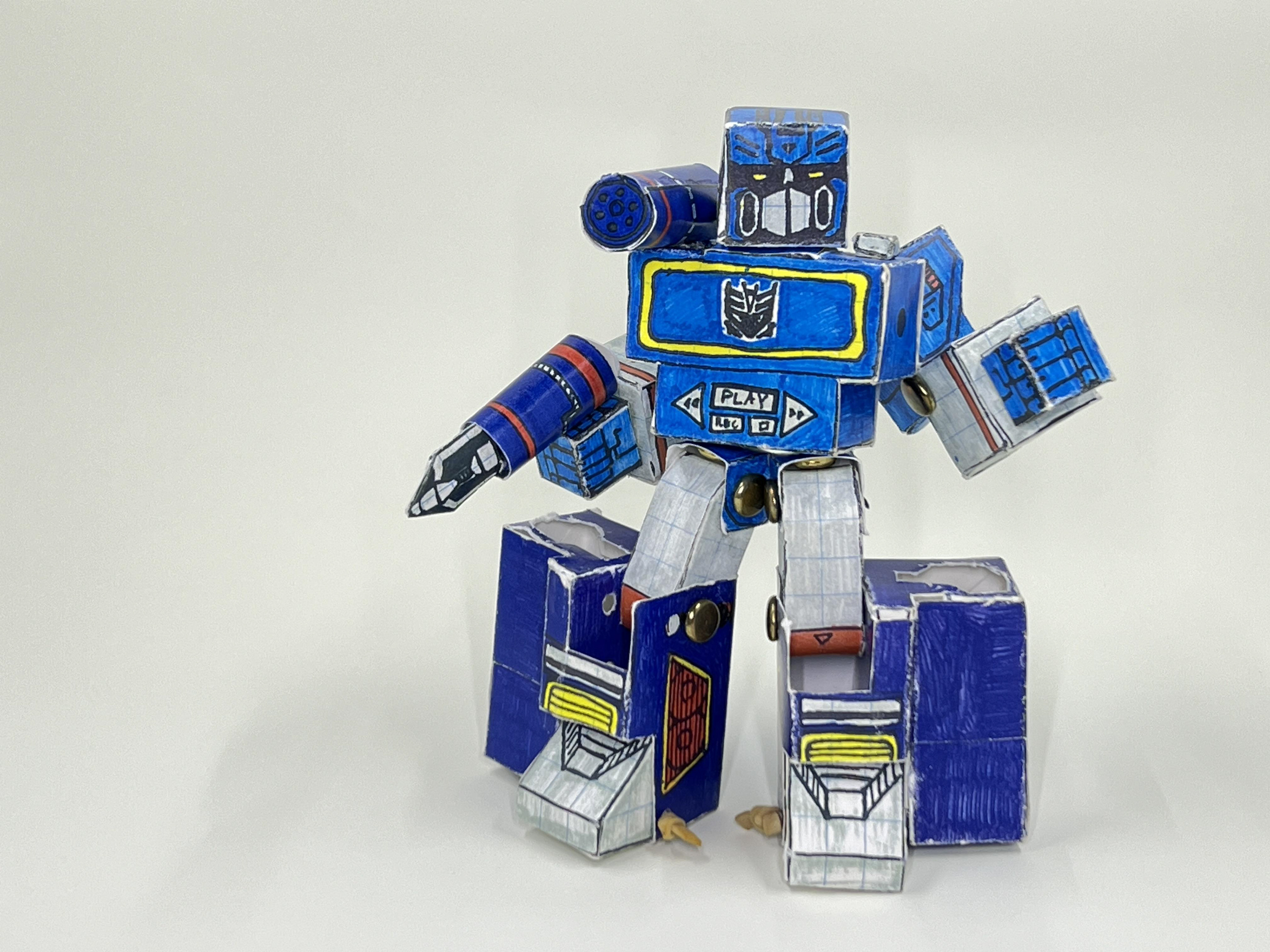 This is my first Soundwave. I couldn't afford one as a kid, so I made one myself out of graph paper, rubber bands, and brass brads. His guns even store in the legs as batteries!